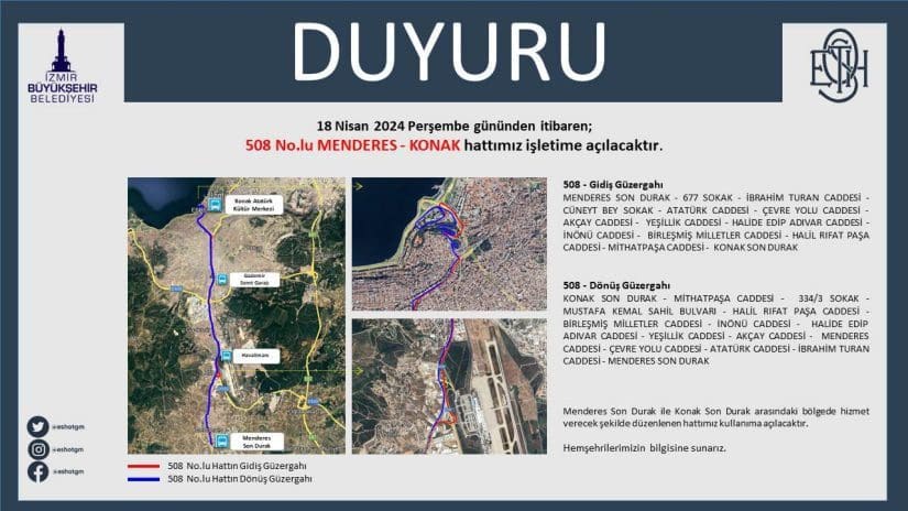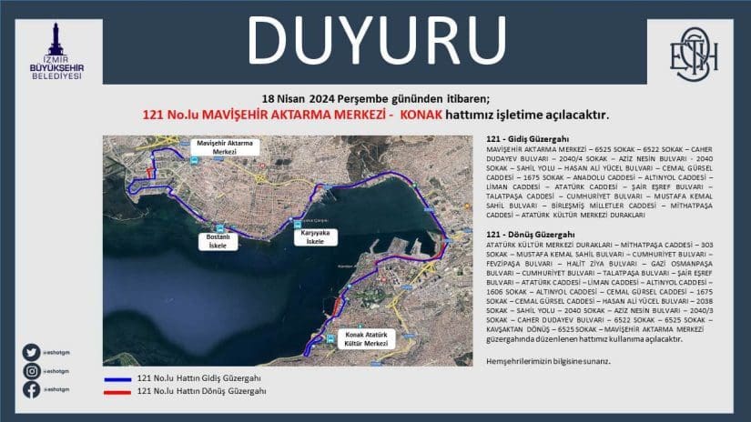 İzmir Büyükşehir Belediyesi Ulaşım Koordinasyon Merkezi (UKOME) Genel Kurulu’nda onaylanan karar gereğince; Mavişehir Aktarma Merkezi-Konak (121) ve Menderes – Konak (508) otobüs hatları, 18 Nisan Perşembe gününden itibaren yeniden hizmet vermeye başlayacak.