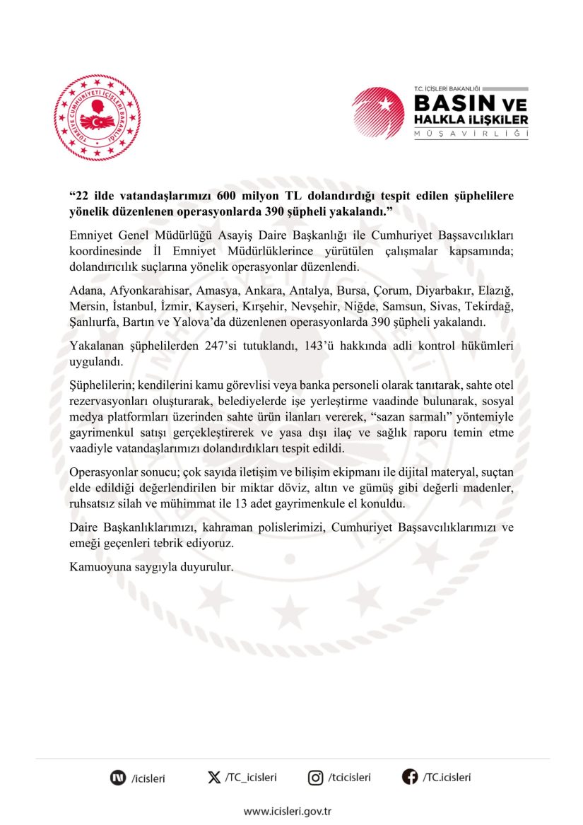 İçişleri Bakanlığı, 22 ilde gerçekleştirilen eş zamanlı operasyonlarda, vatandaşları toplam 600 milyon TL dolandırdığı tespit edilen 390 şüphelinin yakalandığını açıkladı. Operasyonlar sonucunda 247 kişi tutuklanırken, 143 kişi hakkında adli kontrol hükümleri uygulandı.