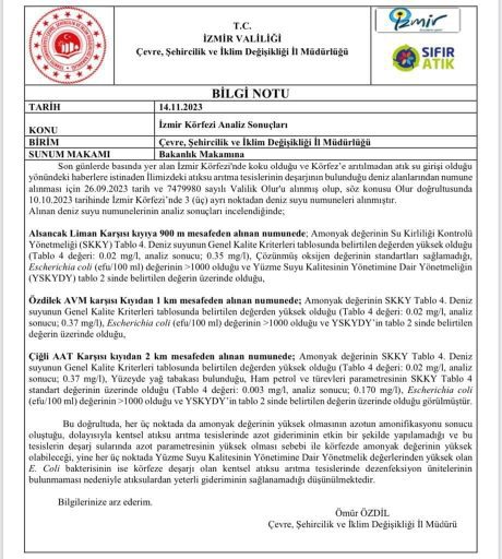 Bu arada Saygılı’nın paylaştığı Çevre ve Şehircilik İl Müdürlüğü verileri, Alsancak, Özdilek ve Çiğli kıyılarından alınan deniz suyu değerlerinin normalin üzerinde olduğunu gösterdi.