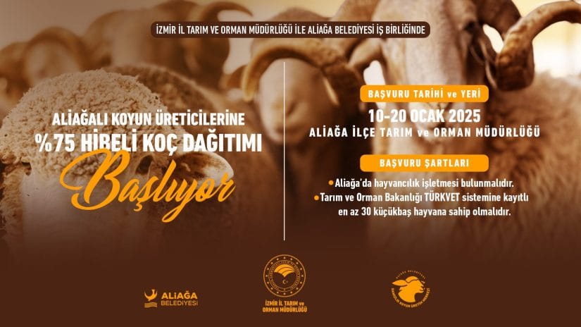İzmir Tarım ve Orman İl Müdürlüğü ile Aliağa Belediyesi iş birliğinde Aliağalı Koyun Üreticilerine yüzde 75 hibeli koç dağıtımı yapılacak. Hibeden yararlanmak isteyen üreticiler, 10-20 Ocak tarihleri arasında Aliağa İlçe Tarım ve Orman Müdürlüğü’ne müracaat edebilecek.