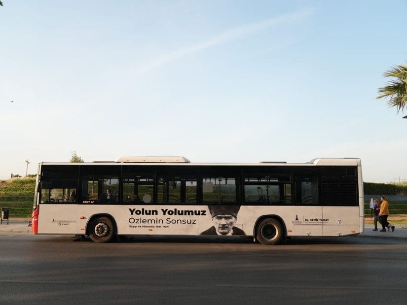 İzmir Büyükşehir Belediyesi ESHOT Genel Müdürlüğü de Büyük Önder Mustafa Kemal Atatürk’ü, ebediyete intikal edişinin 86. yıl dönümünde özel olarak giydirilmiş 10 otobüsle andı. “Yolun yolumuz, özlemin sonsuz” yazılı tasarımla giydirilen otobüsler, saat 09.05’te, İzmirlilerle birlikte saygı duruşuna eşlik etti. Özel araçlar, 10 Kasım Atatürk’ü Anma Günü ve Atatürk Haftası boyunca yollarda olacak.