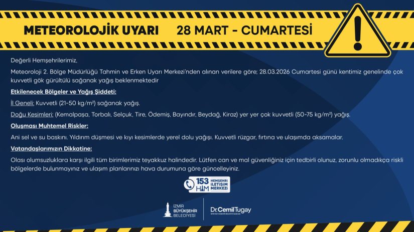 İzmir için 28 Mart Cumartesi günü kuvvetli gök gürültülü sağanak yağış uyarısı yapıldı. Meteoroloji 2. Bölge Müdürlüğü Tahmin ve Erken Uyarı Merkezi’nden alınan verilere göre, kent genelinde etkili olması beklenen yağışların yer yer çok kuvvetli olacağı bildirildi.