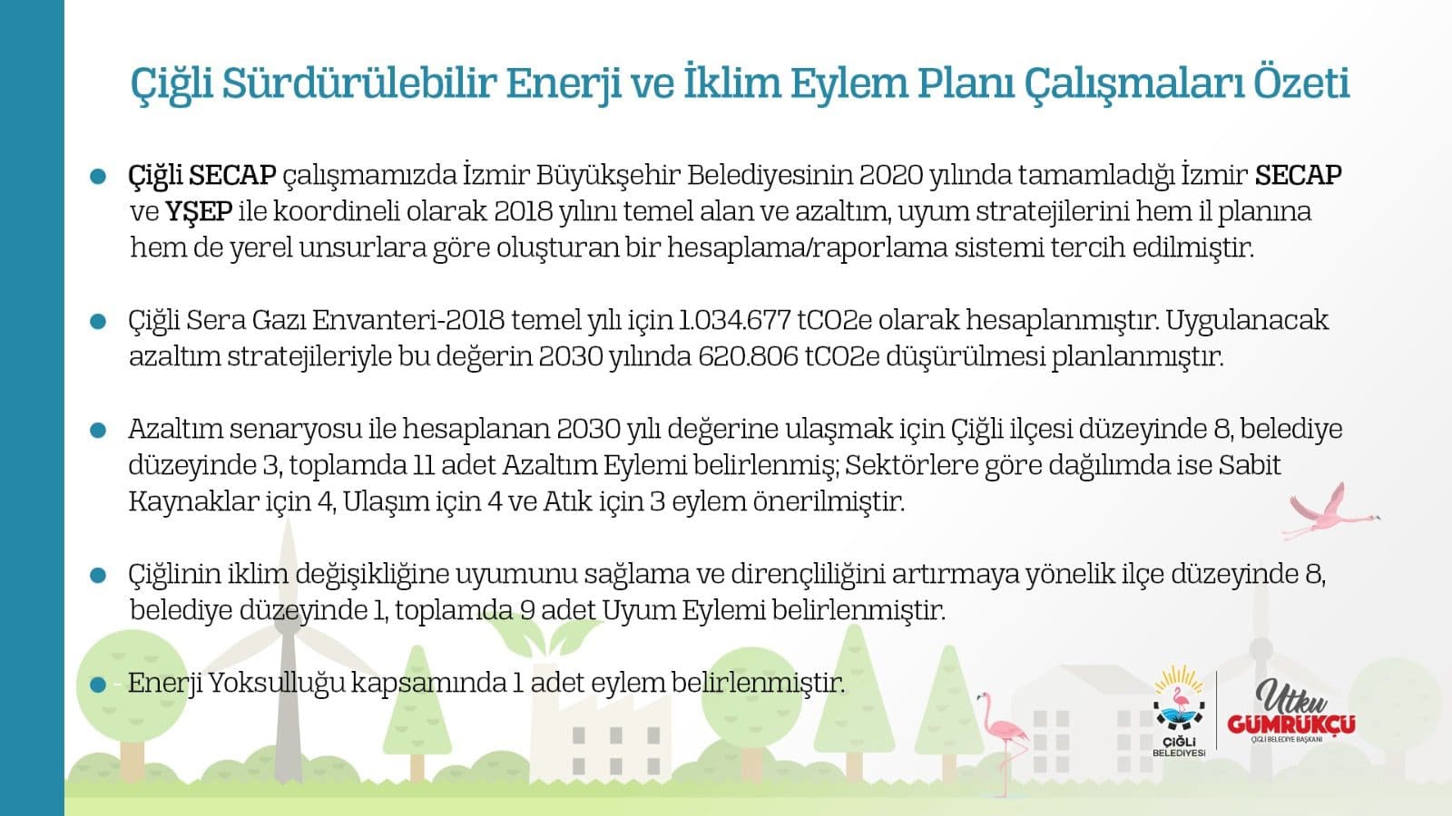 Avrupa İklim Paktı Türkiye Büyükelçisi ve Çiğli Belediye Başkanı Utku Gümrükçü öncülüğünde küresel iklim değişikliğinin yereldeki olumsuz etkilerinin azaltılması ve zaman içerisinde ortadan kaldırılmasına yönelik hazırlanan Çiğli Sürdürülebilir Enerji ve İklim Eylem Planı (SECAP) sonuçlanarak belediye meclisi tarafından onaylandı.