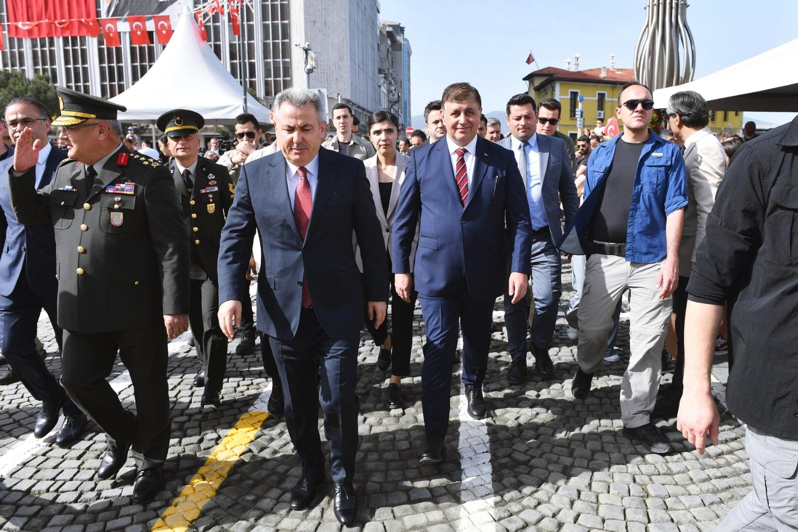 Ulu Önder Mustafa Kemal Atatürk’ün tüm dünya çocuklarına armağan ettiği 23 Nisan Ulusal Egemenlik ve Çocuk Bayramı İzmir’de coşkuyla kutlandı. Resmi kutlamaların adresi Cumhuriyet Meydanı oldu. Törene İzmir Valisi Dr. Süleyman Elban, İzmir Büyükşehir Belediye Başkanı Dr. Cemil Tugay ile eşi Öznur Tugay, Ege Ordusu ve Garnizon Komutanı Orgeneral Kemal Yeni ile eşi Asuman Yeni, İzmir milletvekilleri, siyasi parti temsilcileri, ilçe belediye başkanları, rektörler ve çok sayıda yurttaş katıldı.