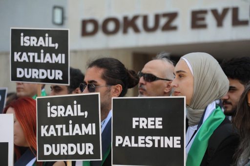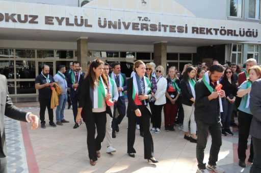 Dokuz Eylül Üniversitesi (DEÜ) öğrencileri, İsrail’in Gazze şehri başta olmak üzere Filistin topraklarında sürdürdüğü saldırıları, düzenledikleri basın açıklamasıyla kınadı. DEÜ çatısı altında öğrenim gören 40 farklı ülkeden öğrencinin katıldığı basın açıklamasında, Filistin halkıyla dayanışma çağrısı yapılarak, Gazze’deki kuşatmaya ve insanlık dramına dikkat çekildi.