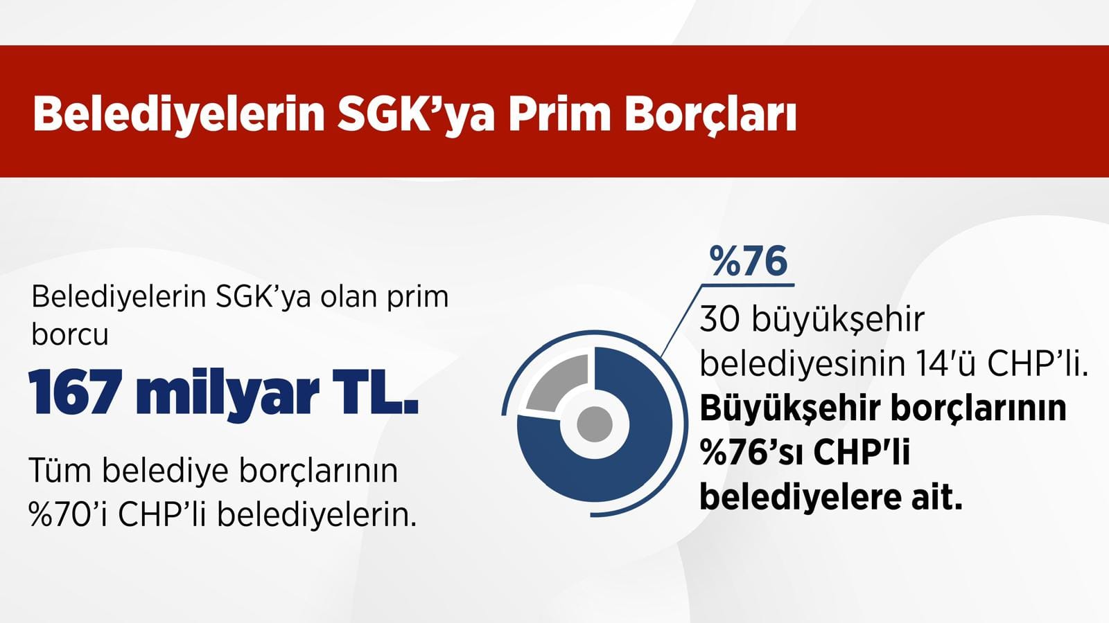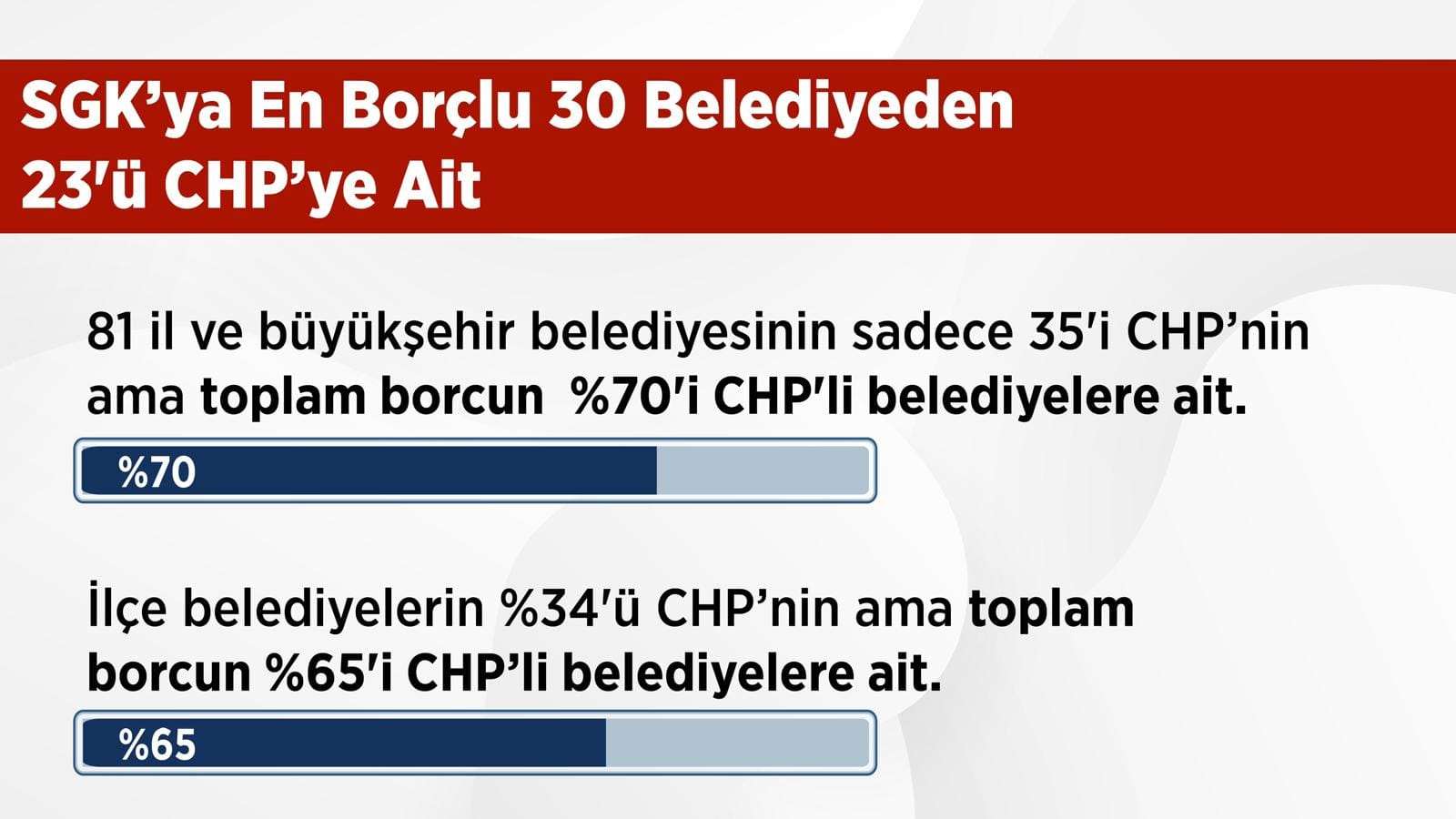 Belediyelerin bugünkü SGK borcu şuan 167 milyar lira bu da yaklaşık 55 ton altın yapıyor. Bu borçların 3’te 1’i CHP’li belediyelerin borcu deniyor. Bu da yanlış. Tüm belediyelerin borçlarının yüzde 70’i tek başında CHP’li belediyelere ait. Bunlarla ilgili tüm belge ve dökümanlar elimizde mevcut. 30 büyükşehir belediyesinin yalnızca 14’ü CHP’li ama büyükşehir borçlarının yüzde 80’e yakını yüzde 76’si CHP’li belediyelere ait.