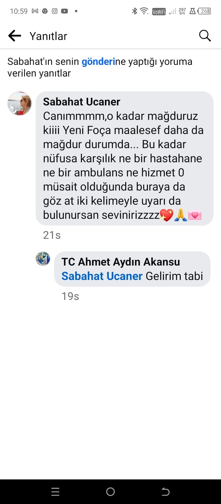Binanın her tarafının dökülüyor ve mazot kokusu hastaları aşırı rahatsız ediyor. Bu sağlık ocağına atanan doktorlar lojmanları olmadığı ve kiralık ev bulmakta zorlandıkları için 3-4 ay sonra çekip gidiyorlar. Eski Foça yazlık bir bölge olduğu için nüfusu 10 kat artıyor, bir de 15 bin asker ve ailesi var. 3 doktor hangi hastaya yetişsin. Bazı kişiler beklemenin acısını doktorların üzerine yürüyerek, bağırarak çıkarmaya çalışıyorlar. Siyasiler oy istemeye gelince yapmadıkları yağcılık kalmıyor, şikayetlerimize gelince duyan yok. İzmir Sağlık İl Müdürü gelip bir gün şu binanın durumunu, koridordaki hastaları görsün, onların sıkıntılarını bir dinlesin, doktorların neler çektiklerini dinlesin. Sabrımız taştı, CİMER’e yazacağız” dedi.