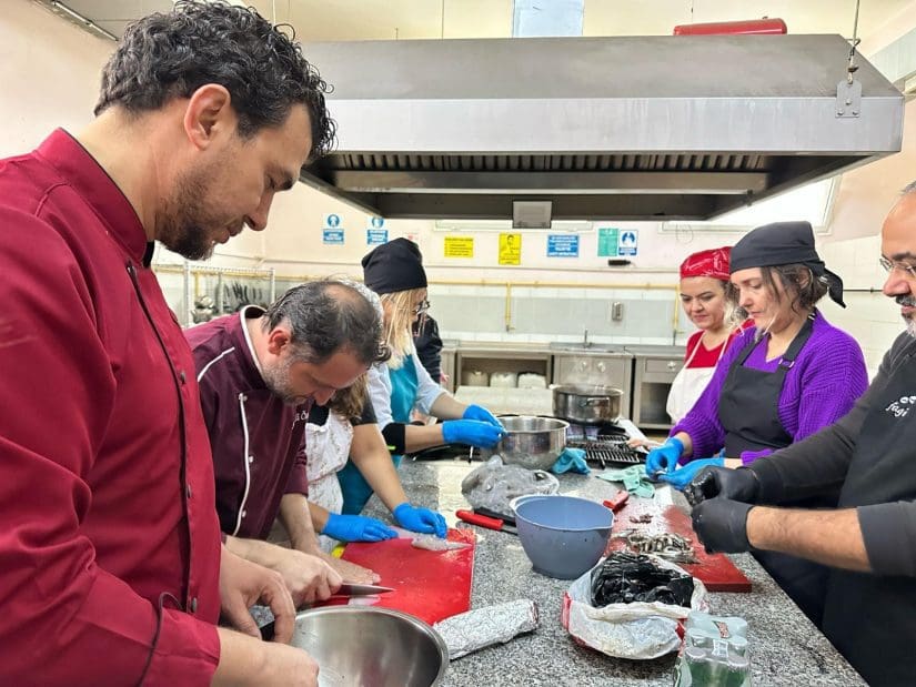 Şehir ve Kültür Akademisi-Şehir ve Yemek Kültürü’ atölyesine katılan öğretmenler, Konak Nevvar Salih İşgören Eğitim Kampüsü-5 Mesleki ve Teknik Anadolu Lisesi mutfağında uygulamalı eğitim aldı. Yiyecek İçecek Hizmetleri Alan Öğretmenleri İsmail Yıldırım ile Seyit Ali Özcan’ın verdiği eğitimin ilk hafta konusu, İzmir mutfağının vazgeçilmezlerinden olan deniz ürünlerinin hazırlanması ve sunumu oldu. İlk kez bir araya gelen öğretmenler, atölyede hazırlayıp pişirdikleri deniz ürünlerinin tadımını birlikte yaparken meslektaşlarıyla keyifli zaman geçirdi.