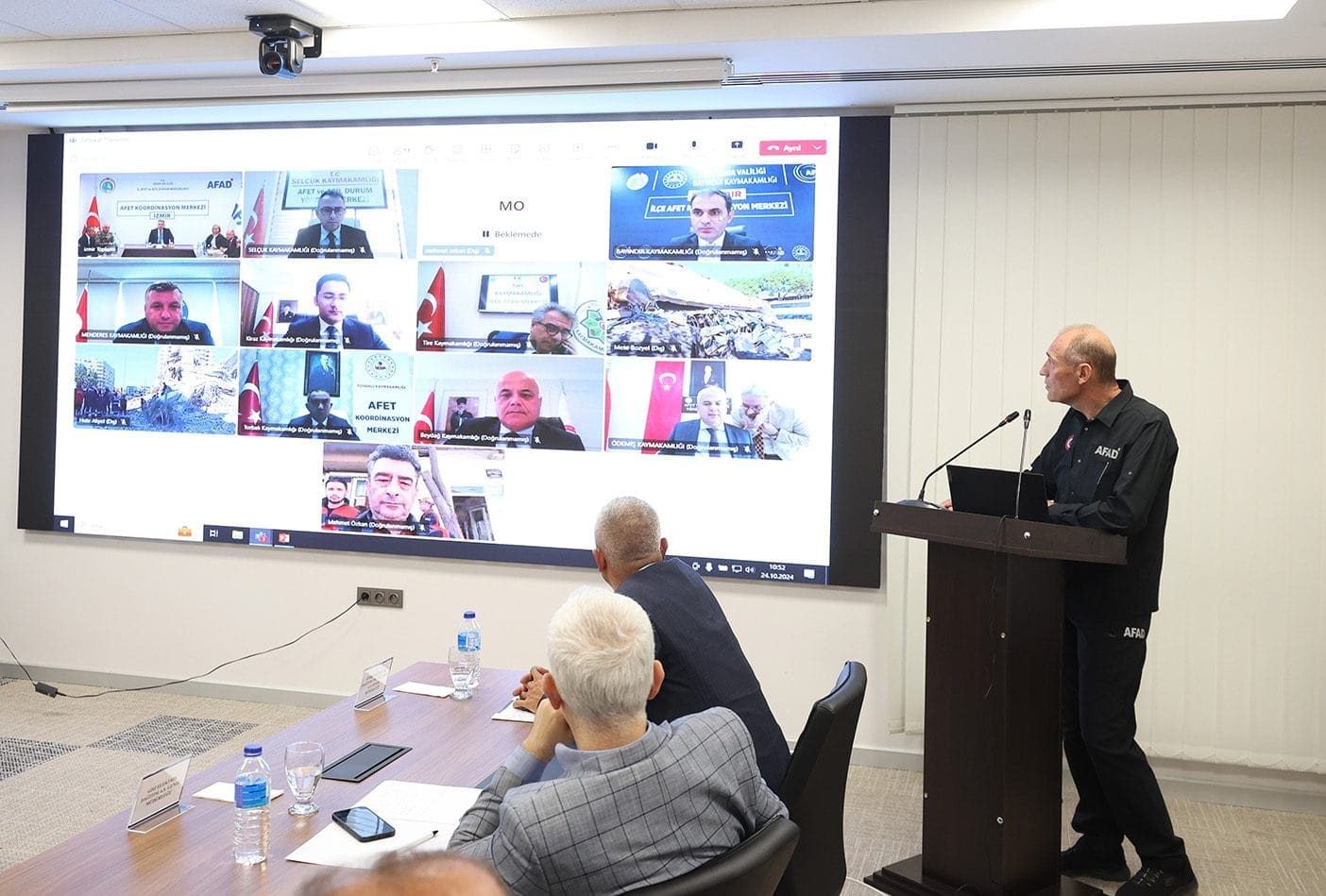 İzmir İl Afet ve Acil Durum Müdürü Nazif Ekinci, Vali Elban ve İl Afet ve Acil Durum Koordinasyon Kurulu üyelerine, tatbikatın amaç, kapsam ve hedefleri yanında uygulamaya konulan deprem senaryosuyla ilgili sunum gerçekleştirdi.