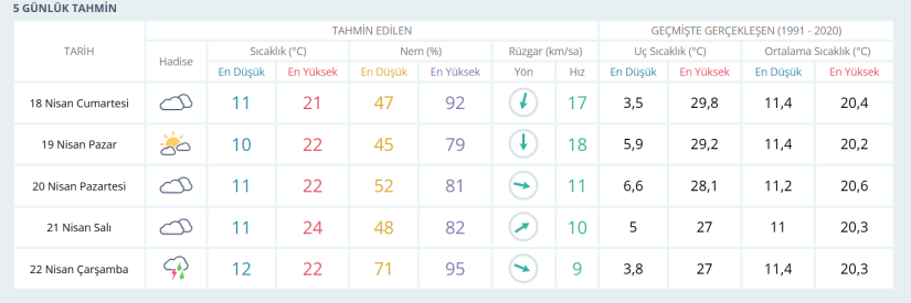22 Nisan Çarşamba günü ise yağışlı hava etkili olacak. Sıcaklıkların 12 ila 22 derece arasında olması beklenirken, nem oranının yüzde 71 ile 95’e kadar yükselmesi öngörülüyor. Rüzgarın hızının 9 kilometre seviyesinde kalacağı tahmin ediliyor.