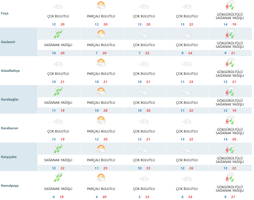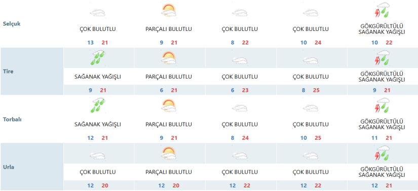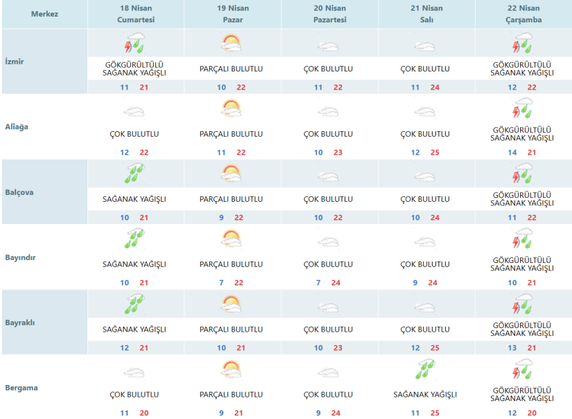 İzmir için açıklanan 5 günlük meteoroloji tahminlerine göre kentte hafta sonundan itibaren parçalı bulutlu bir hava etkili olacak, sıcaklıklar ise kademeli olarak artacak. Hafta ortasında ise yağış beklentisi öne çıkıyor.
