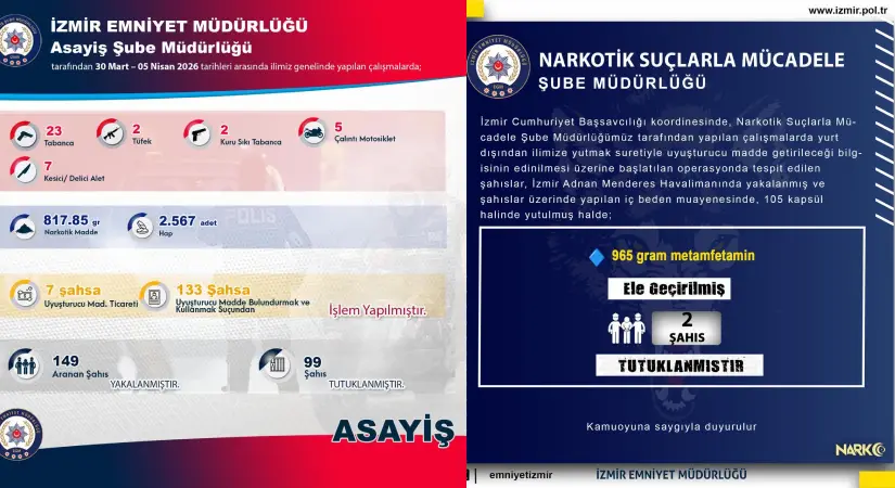 İzmir Emniyet Müdürlüğü tarafından kamuoyuyla paylaşılan verilere göre, 30 Mart – 5 Nisan 2026 tarihleri arasında yürütülen çalışmalar kapsamında kent genelinde önemli operasyonlara imza atıldı.
