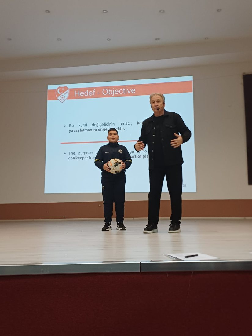 Gelişimci insan Hasan Aral başkanlığındaki TÜFAD İzmir yönetimi, üyelerine kural dersi vermek istedi, duyurular yapıldı. Sayı çok azdı, çocuklar salonu çoğalttı. Geçerli mazeret tamam da gelmeyene vize yapmamak gerek. Minik, çocuk öğrencileriyle gelen antrenörlerimiz salonu cıvıl cıvıl yaptı. Teşekkürler. Zordur miniklerle, hepsi afacan maşallah. Ailelerden izinle, getirdiler. Hakem Eğitim Sorumlusu Sebahattin Şahin, süper ligdeki yabancı futbolcular dahil, teknik ekiplere ders veriyor. 10 yaşındaki evlatlara da kısmet oldu. Bundan daha güze ne olabilir ki. Sınıfta gibi söz istediler, ayağa kalktılar. Herkes görsün tanısın diye. Özgüvene katkı. Sahneye de çıkarıldı evlatlar, canlı ve de heyecanlı sordular. Hepsi de kayda geçti. Dilerseniz isteyebilirsiniz, bulabilirsiniz. ‘Bir şey sorabilir miyim’ dedi. Belki de en doğru yerde ve zamanda bu soruyu yönelten olarak parmak da kaldırdı. Söz de kesmedi, işte sporcu. Kaptanmış takımında belli, hocaları da Mehmet Emin Yılmaz ile Furkan Çıracı, eğitim süperdir, garanti. Yolunuz doğru harkasınız. Menemen FK U-13 takım kaptanı Ali Hamza Gümüş, soru yöneltti merak etti. Kız futbolcularımız da geldi, soruları çok mantıklıydı. Hiç de sıkılmadılar. MHK Üyesi Şahin de zaten hap yapıp, içirdi resmen. Düzeylerine de inerek, örneklerle anlattı. Aslında 10 yaşından itibaren kuralları öğretirsek, öğrenirlerse en az 20 yılımız garanti. Büyüyünce de aradaki farkı görürler. Hiç bilenle bilmeyen bir olur mu ? Meslektaşına tekme de atmaz, küfür de etmez, saçma sapan zamanda takımını yalnız bırakmaz, kart görmez ve de sahadan atılmaz. Bu kadar basit ve net, eğer bilirse eğer ki öğrenirse. Salon dolup taşmadı, aslında sayı o kadar da önemli değil. Popstar, youtuber geliyor dense o salon dolar taşardı. Bırak başkalarının hayatlarını, göz önündekileri. Baksana sen önüne, o ana, şimdiye. Oynayacağın 10-15 yıl. Dikkat et, sağılığına, düzenine, bir de kuralları öğren, valla mis gibi olur. Çok sevdiğin oyunu oynarsın, eğitimin öğrenimin de devam eder tabii ki de. Boş işlerle uğraşmazsan, fırsatlar değerlendirilirse. Gelsin şöhret, para, geleceğe yatırım. Evlatlarım gün sizin, haydi göreceğim sizleri. TÜFAD İzmir Üyesi olan, teknik adamlar, antrenörlerle, başkan ve yöneticiler Nedim Vatansever, Ömer Aktaş, Ece Tosunoğlu, Ömer Çavuşoğlu, Ege Oral (hasta idi gelemedi), Mehmet Emin Yılmaz, Furkan Çıracı da dikkatle dinledi. TÜFAD İzmir Genel Sekreteri, İlker Karabacak mikrofonik sesiyle dinletilir sunum yaptı. Futbol oynarken maçlarını yönettiğim, antrenör Yüksel Öğretim de video ve fotoğraf çekimleri ile destek oldu.