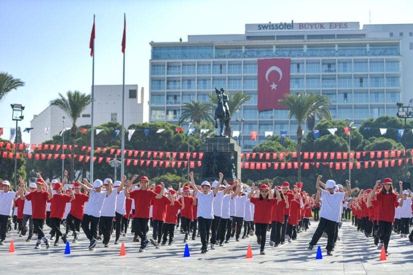 Kutlamalar kapsamında Cumhuriyet Meydanı’nda büyük şölen yaşandı. Türk Silahlı Kuvvetleri Bandosu’nun İstiklal Marşı ve saygı duruşuyla başlayan coşku, okul ve üniversitelerin halk dansları gösterileriyle devam etti. Ege Üniversitesi Halk Dansları Topluluğu, İzmir Yüksek Teknoloji Enstitüsü Dans Topluluğu’nun performanslarının ardından İzmir İl Milli Eğitim Müdürlüğü’ne bağlı okullardan 500 ilköğretim öğrencisi, çeşitli yörelerden ve modern dansların bir arada yer aldığı koreografiyi gerçekleştirdi. Marşlara ve türkülere hep birlikte eşlik eden İzmirliler, gönüllerince bayramı kutladı.
