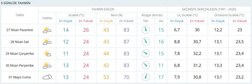 Haftanın ilk günü olan 27 Nisan Pazartesi günü en düşük sıcaklık 14, en yüksek sıcaklık ise 26 derece olarak öngörülüyor. Nem oranı yüzde 43 ile 83 arasında değişirken, rüzgarın saatte yaklaşık 15 kilometre hızla esmesi bekleniyor.