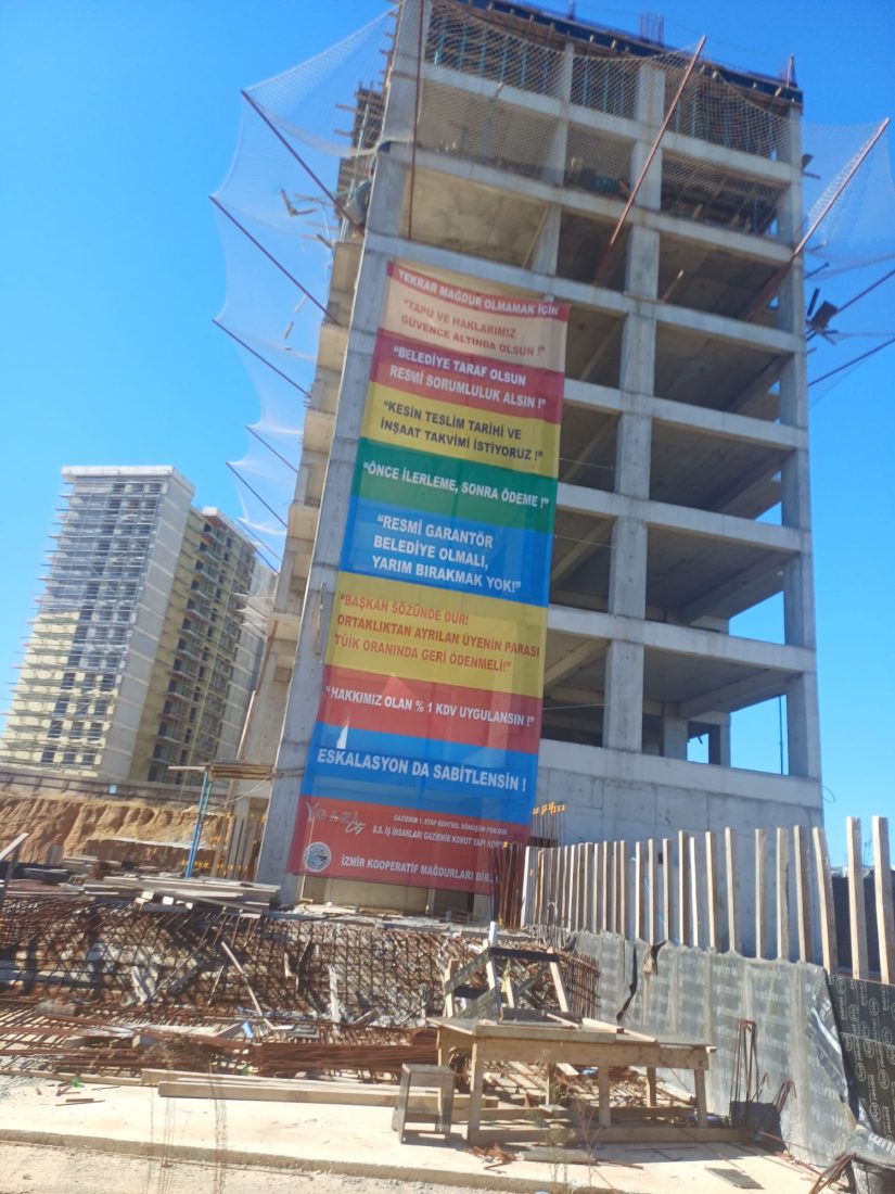 İzmir’de İzmir Büyükşehir Belediyesi, İZBETON ve EGEŞEHİR öncülüğünde “Belediye garantörlüğünde güvenli konut” vaadiyle kurulan yapı kooperatiflerinin üyeleri, şantiyeden yaptıkları açıklamayla mağduriyetlerini kamuoyuna duyurdu. Yaklaşık 5 bin aileyi kapsayan projelerde inşaatların 1,5 yıldır durduğunu belirten kooperatif üyeleri, “O güvenin enkazı altında hukuk mücadelesi veriyoruz” diyerek yaşadıkları sürece tepki gösterdi.