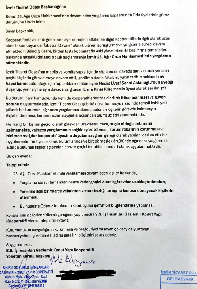 İzmir’de kamuoyunda “İZBETON Davası” olarak bilinen soruşturma ve yargılama süreci sürerken, S.S. İş İnsanları Gaziemir Konut Yapı Kooperatifi, İzmir Ticaret Odası (İZTO) bünyesinde görev yapan ve davada sanık olarak yargılanan isimlerle ilgili önemli bir çağrıda bulundu. Kooperatif yönetimi, ağır ceza davası devam eden kişilerin geçici olarak görevden uzaklaştırılmasını talep ederek Oda yönetimine resmî başvuru yaptı.