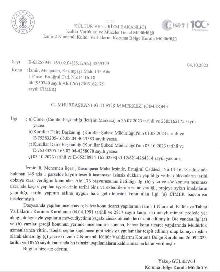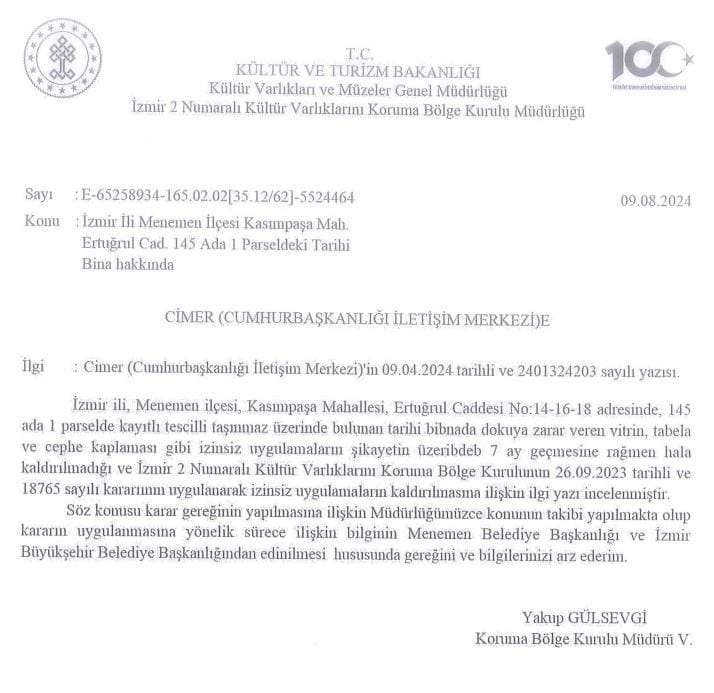 Bir yurttaş, iki yıldır yalnız başına mücadele ediyor. Defalarca CİMER’e yazıyor, Kültür ve Turizm Bakanlığı’na sesleniyor. Yetmiyor, belgelerle konuşuyor. Çünkü biliyor; bu köşk giderse, Menemen’in belleğinden bir sayfa daha yırtılacak. Kültür Varlıklarını Koruma Kurulu da bu sesi duyuyor ve 26 Eylül 2023’te açıkça karar veriyor: “Bu izinsiz uygulamalar kaldırılmalı!” Ancak karar orada kalıyor. Kağıt üzerinde. Tozlu raflarda.