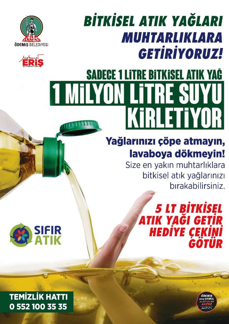 “5 litre Bitkisel Atık yağı getir hediye çekini götür” sloganıyla düzenlenen kampanya için atık yağ toplama bidonlarının muhtarlıklara dağıtımına katılan Ödemiş Belediye Başkanı Mehmet Eriş, “Türkiye’de her yıl yaklaşık 2 milyon ton bitkisel yağ tüketiliyor. Bu yağlarının kullanımı sonucunda ise yıllık olarak yaklaşık 400 bin ton bitkisel atık yağ oluştuğu tahmin ediliyor. Temizlik İşleri Müdürlüğü ekiplerimiz tarafından bu kritik hususla ilgili yapılan bilgilendirme çalışmalarında doğaya kontrolsüzce bırakılan 1 litre atık yağın 15 kişinin bir yıllık içme suyuna zarar verdiği hatırlatılarak konunun önemine dikkat çekiliyor. Vatandaşlarımızın sıvı atık yağlarını muhtarlıklarımıza getirmelerinin yanı sıra toplu şekilde bulunan sıvı atık yağlar için Ödemiş Belediyesi 1. Sınıf Atık Getirme Merkezi’ne 0232 545 12 94 numaralı telefondan ulaşılabiliyor” dedi.