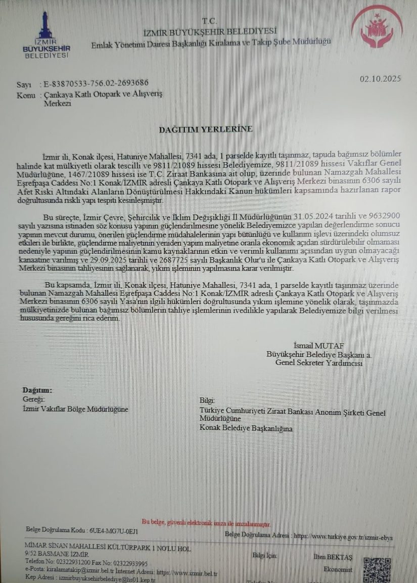İzmir Büyükşehir Belediyesi, geçtiğimiz yıl önce ‘yıkılmalı’ dediği ardından Çevre Şehircilik ve İklim Değişikliği Bakanlığı tarafından ‘güçlendirilebilir’ onayı alınca geri adım attığı Çankaya Çok Katlı Otopark ve AVM için yeniden düğmeye bastı. Hükümet kanadından karara ilk tepki süreci başından bu yana takip eden AK Parti İzmir Milletvekili Ceyda Bölünmez Çankırı’dan geldi. Çankırı, yaptığı yazılı açıklamada 19. Asliye Hukuk Mahkemesi’nin tespitinin, Koruma Kurulu’nun güçlendirme yönündeki kararının, Çevre, Şehircilik ve İklim Değişikliği İl Müdürlüğü ile Vakıflar Genel Müdürlüğü’nün resmi protokol onaylarının da dikkate alınmadığına dikkat çekti.