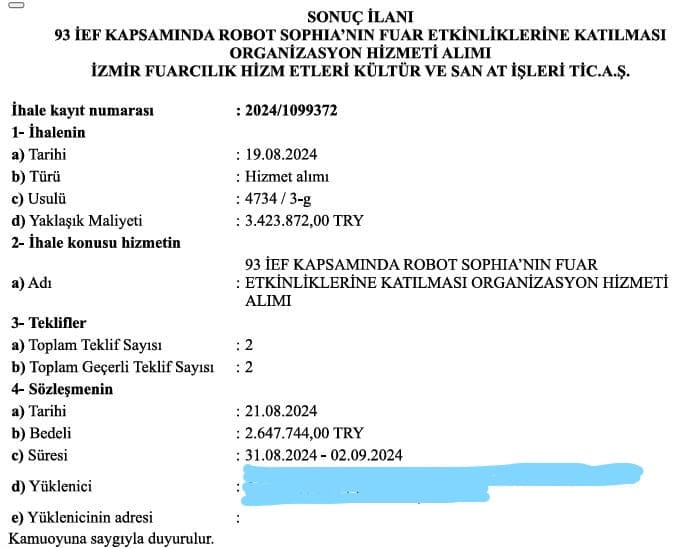 Ak Partili Atmaca, 93. İzmir Enternasyonal Fuarı kapsamında Robot Sophia’nın fuar etkinliklerine katılması organizasyonunda hizmet alımı için İzBB iştiraki şirketi İZFAŞ’ın ihale kapsamında 2 milyon 647 bin 744 TL ödeme yapacağını açıkladı.