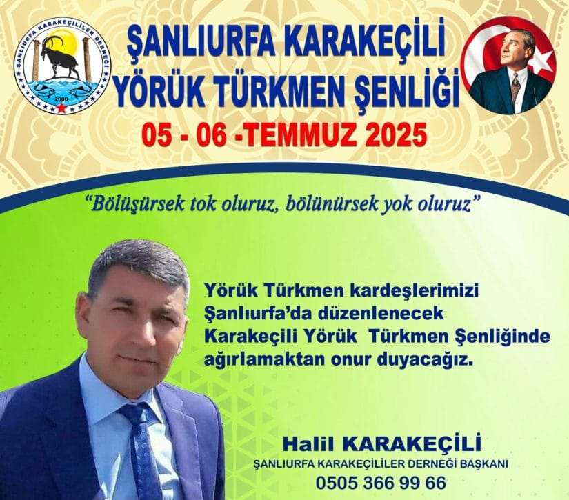 Şanlıurfa’nın tanıtımına ve turizmine katkı sağlayacak olan Karakeçili Yörük Türkmen Şenliği için geri sayımın başladığını söyleyen Şanlıurfa Karakeçililer Dernek Başkanı Halil Karakeçili, “Bu sene ikincisi düzenlenecek olan şenliği 5-6 Temmuz’da. Tüm Yörük ve Türkmenlerimizi 5-6 Temmuz 2025’de Şanlıurfa’mızda yapacağımız Karakeçili Yörük Türkmen Şenliği’mize bekliyoruz. Hem kültürümüzü tanıtacağımız hem de üyelerimizle keyifli zaman geçireceğimiz bu şenlik ülke çapında da son derece önem taşıyor. Tüm camiamıza hayırlı uğurlu olsun.” dedi.