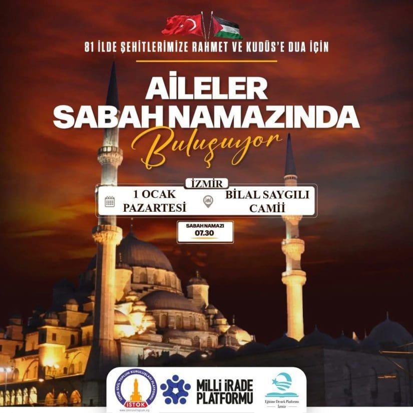 Sivil Toplum Kuruluşları’nca organize edilen, Aileler Sabah Namazında buluşması 2024’ün ilk gününde Bilal Saygılı Camii’nde gerçekleşti. 81 ilde şehit askerlerimize rahmet ve Filistin-Gazze’de zulüm gören, İsrail’in acımasızca soykırım uyguladığı müslümanlar için Kudüs’e duaların okunduğu sabah namazına AK Parti İzmir İl Başkanı Bilal Saygılı da iştirak etti.