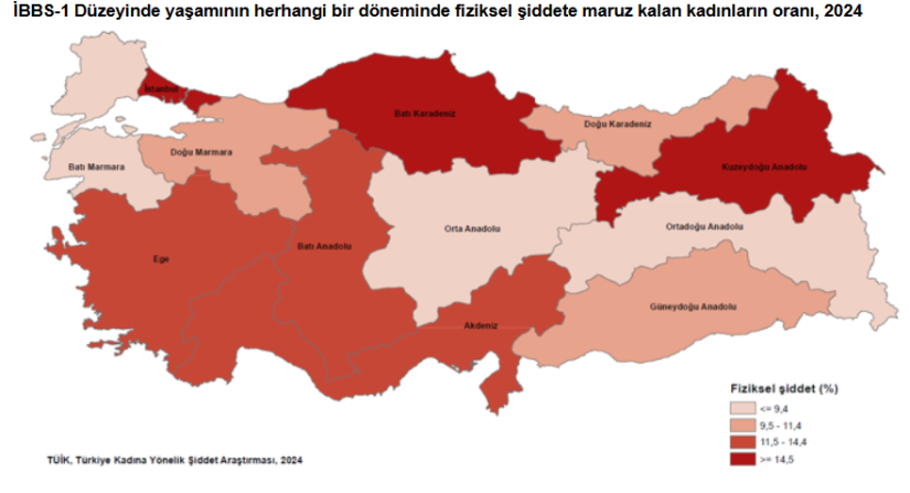 Fiziksel şiddetin en yoğun görüldüğü bölge %25,9 ile Kuzeydoğu Anadolu, en düşük olduğu bölge ise %8,8 ile Ortadoğu Anadolu olarak belirlendi.