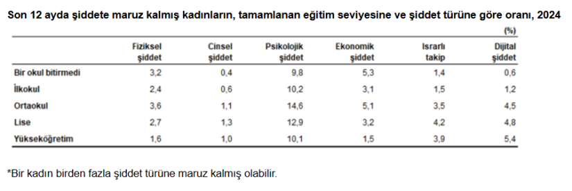Araştırmaya göre, son 12 ayda kadınların %11,6’sı psikolojik, %3,7’si dijital, %3,2’si ekonomik, %3,1’i ısrarlı takip, %2,6’sı fiziksel, %0,9’u cinsel şiddete maruz kaldı.