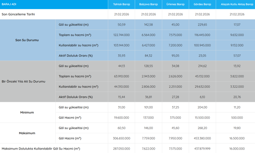 Kentte etkili olan yağışlar içme suyu rezervlerine olumlu yansıdı. İZSU’nun 21 Şubat 2026 tarihli verilerine göre İzmir’e su sağlayan barajların tamamında doluluk oranları geçen yılın aynı dönemine kıyasla yükseldi. Artış kısa vadede rahatlama sağlarken, toplam kapasiteye göre mevcut seviyeler temkinli bir tabloya işaret etti.