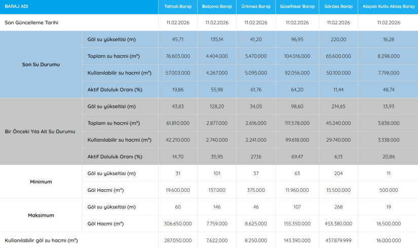 Yağışların günlük yaşamda sel ve su baskınlarına yol açtığı günlerin ardından, barajlardaki yükseliş “çelişkili bir tabloyu” ortaya koydu. Kentin ana içme suyu kaynaklarından Tahtalı Barajı’nda doluluk oranı 9 Şubat’ta yüzde 17,75 iken, 10 Şubat’ta yüzde 19,05’e, 11 Şubat itibarıyla ise yüzde 19,86’ya çıktı. Üç günde 2,11 puanlık artış kaydedildi.