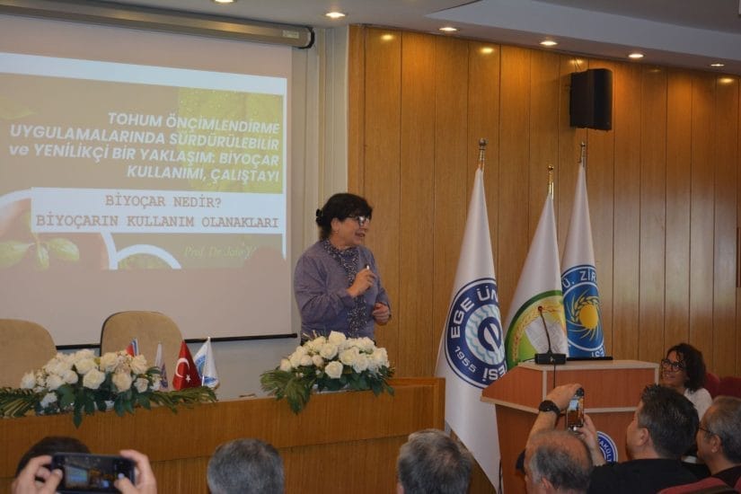 Ege Üniversitesi Ziraat Fakültesi tarafından “Tohum Önçimlendirme Uygulamalarında Sürdürülebilir ve Yenilikçi bir Yaklaşım: Biyoçar Kullanımı” başlıklı çalıştay gerçekleştirildi. Dekanlık Konferans Salonunda düzenlenen etkinliğe Ziraat Fakültesi Bahçe Bitkileri Bölüm Başkanı Prof. Dr. İbrahim Duman, akademisyenler ve öğrenciler katıldı. Etkinlikte konuşmacı olarak EÜ Fen Fakültesi Kimya Bölümü öğretim üyesi Prof. Dr. Jale Yanık, Toprak Bilimi ve Bitki Besleme Bölümü öğretim üyesi Prof. Dr. H. Hüsnü Kayıkçıoğlu ve Bahçe Bitkileri Bölümü öğretim üyesi Prof. Dr. M. Kadri Bozokalfa yer aldı.